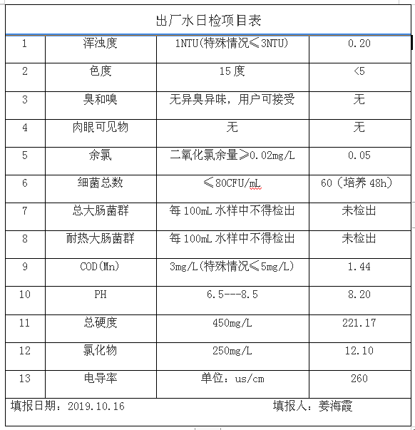 2019年10月16日水質檢測報告
